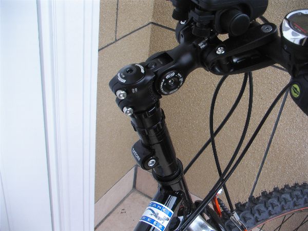 これは最初の頃のなんちゃってアヘッドです。SATRIのステムハイライザーにMC-Jのアジャスタブルスペーサーを噛ましていたものです。ポジションは超ラクで良かったのですが、ステム部分が長すぎて外観的に難アリでした。