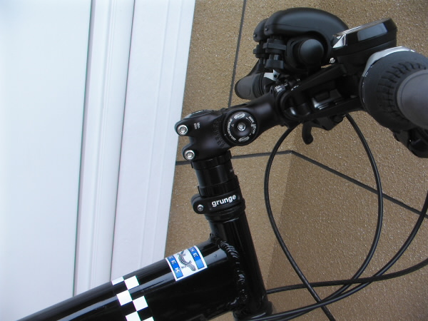 そこで次にSATORIのステムハイライザーを外して高さを低くしてみました。アヘッド化にあたっては、ITMのスレッドレスコンバーターを差し込んで、そこにMC-Jのアジャスタブルスペーサーを噛ませて、BBBのアジャスタブルステムを組み合わせています。尚、なんちゃって化で一番見っとも無いロックナット部分には、グランジのシートポストクランプを装着しています。34.9mmサイズが実にピッタリで、綺麗にカバーしてくれています。これは我ながら良いアイデアだったと思います。これでパッと見にはなんちゃってアヘッドには見えない??