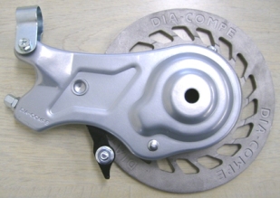 リヤブレーキですが、純正のバンドブレーキの効きそのものは問題無かったのですが、キーキー鳴きだしており交換を余儀なくされていました。最初はサーボブレーキへ交換しようと思っていたのですが外観的に面白みがありません。そこでダイアコンペのMLB-50メタルリンクブレーキを採用です。外観はディスクブレーキ風の放熱板が付いており、シマノのローラーブレーキと同じような感じなのですが、バンドブレーキとハブ周りが同じなので、専用ハブも必要なく無駄な出費を抑える事が出来るわけです。因みにシマノのローラーブレーキは専用のハブ周りも必要だとの事ですので、交換するとなると結構なコストが掛かってしまいます。このダイヤコンペ製のメタルリンクブレーキ、ネット上でわずかですが何例が装着例があり、交換前に何とか雰囲気を掴め非常に参考になりました。また取り扱いショップも非常に少ないようで、ざっと検索した限りでは1店舗しか引っかかりませんでした。因みにメタルリンクブレーキの外観はこんなのです。完成車についているのを見たこと無いのですけど、採用例はあるんでしょうかねぇ?