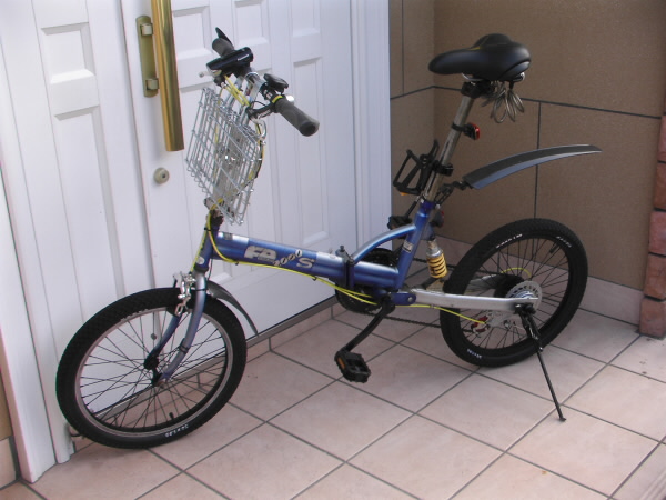 基本構成としては20インチの折り畳みで、リヤにサスペンションが付きで6段変速です(クランク44T、スプロケットは14~24Tで変速は6段変速でシマノ製のシフターを装備)。折りたたみ機能としては、フレーム折り畳み、シートポストとハンドルは簡単に短く出来て、更にハンドルポストも折れて全体としては結構小さく折りたためます。フレームは恐らくスチールですので結構な重さで、感覚的に15kgくらいはあります。ペダルも最初は折りたたみ式でしたが、一度折れてしまい固定式に交換しました。サドルも本来は黒でしたが、破れてしまったのでホームセンターで購入した幅広の茶色のコンフォート系のサドルへ交換しています(下写真の状態)。